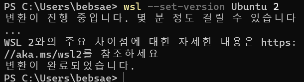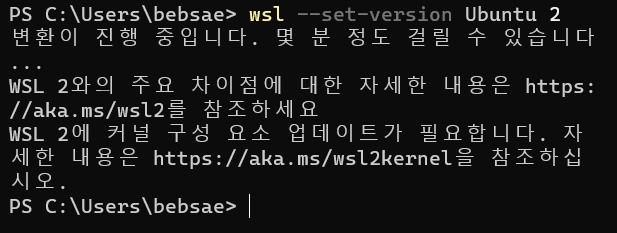 이제 다시 wsl --set-version Ubuntu 2 명령어를 실행해주세요.