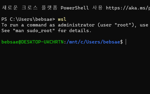 wsl이라는 명령어를 입력하였을때 아래 화면과 같이 뜨면 정상적으로 설치가 완료된겁니다.
