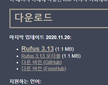 우리는 제일 위에 있는 'Rufus 3.13(1.1MB)'를 눌러 루푸스를 설치해줄 것입니다.