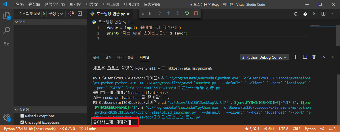 이번에는 input()함수를 통해 favor라는 변수에 값을 입력받도록 하겠습니다.