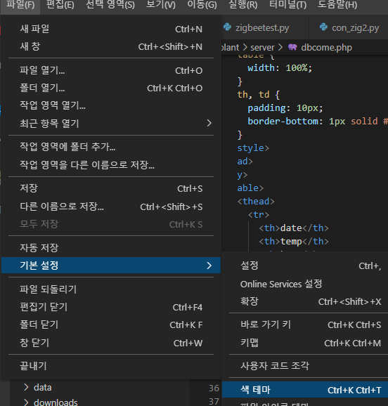 [파일]-[기본 설정]-[색 테마]로 들어가줍니다.