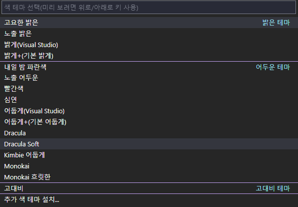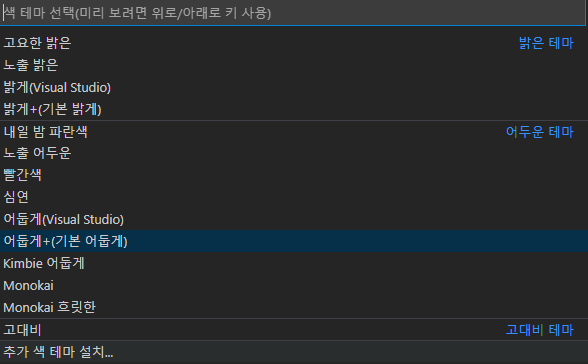 여기서 원하는 테마를 선택하셔도 되지만, 다른 테마를 원하신다면 가장 하단의 [추가 색 테마 설치...]를 눌러주세요.