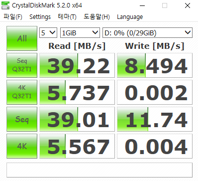 우선 USB2.0포트에 꽂았더니 읽기는 39MB/s 쓰기는 8~11MB/s정도로 나옵니다.
