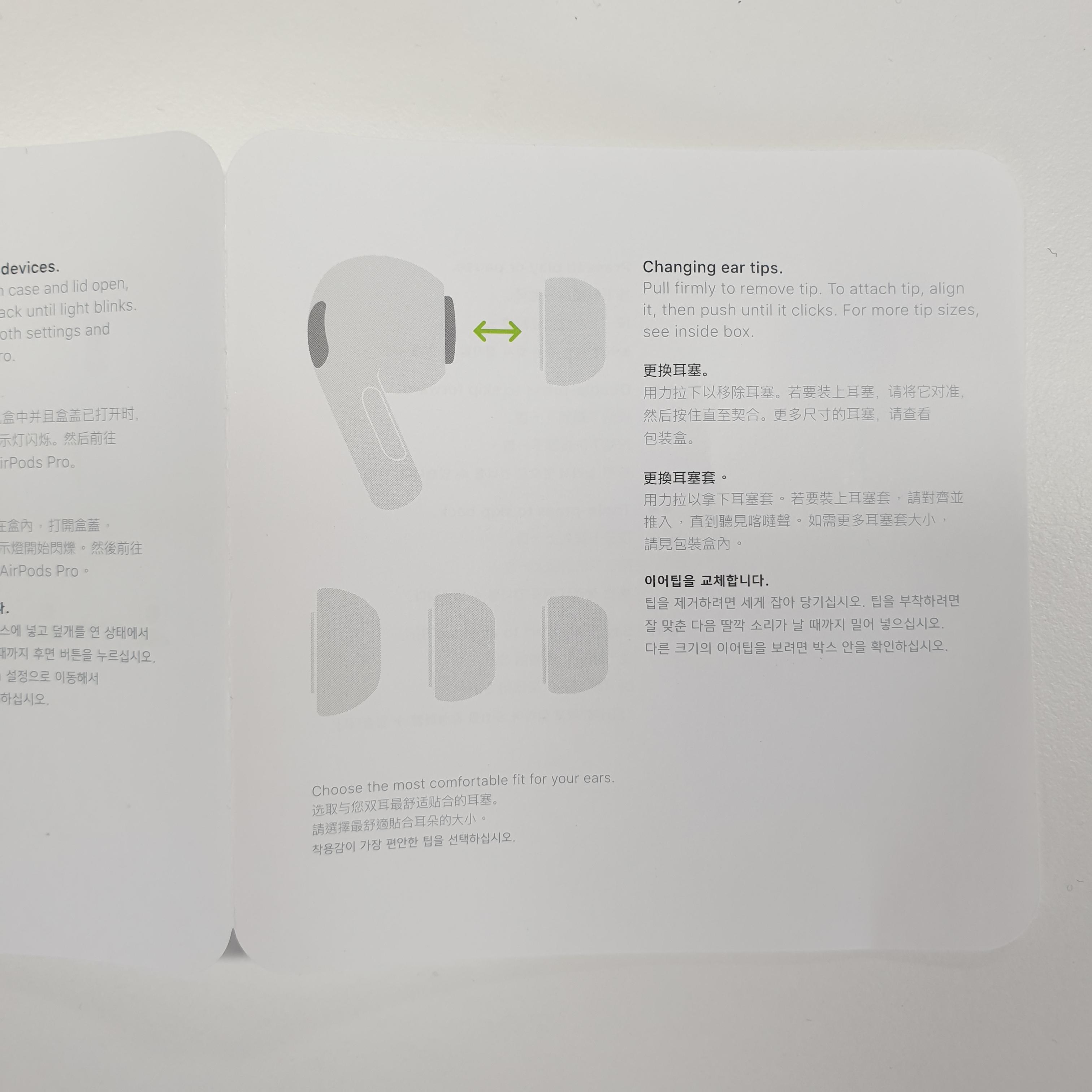 설명서에서는 4개국어로 에어팟 프로를 설명하고 있습니다.