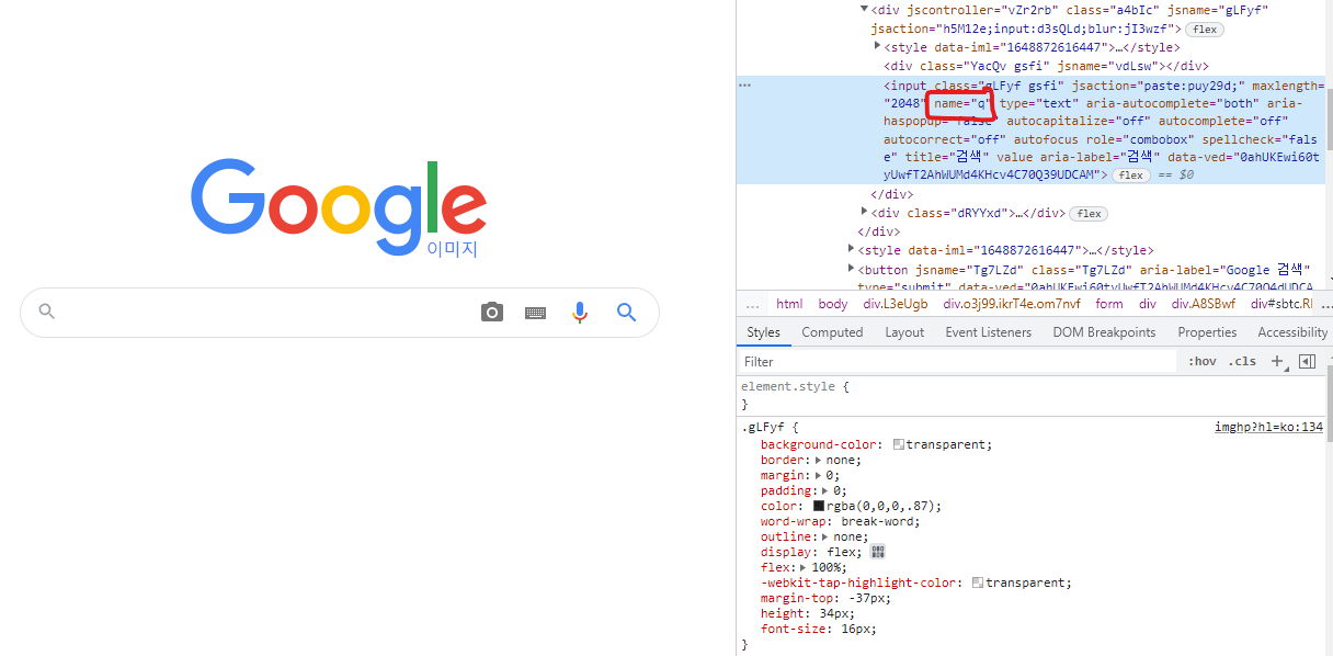 개발자도구로 구글 이미지 검색 페이지의 검색창의 name 속성은 "q"인것을 확인할 수 있습니다.