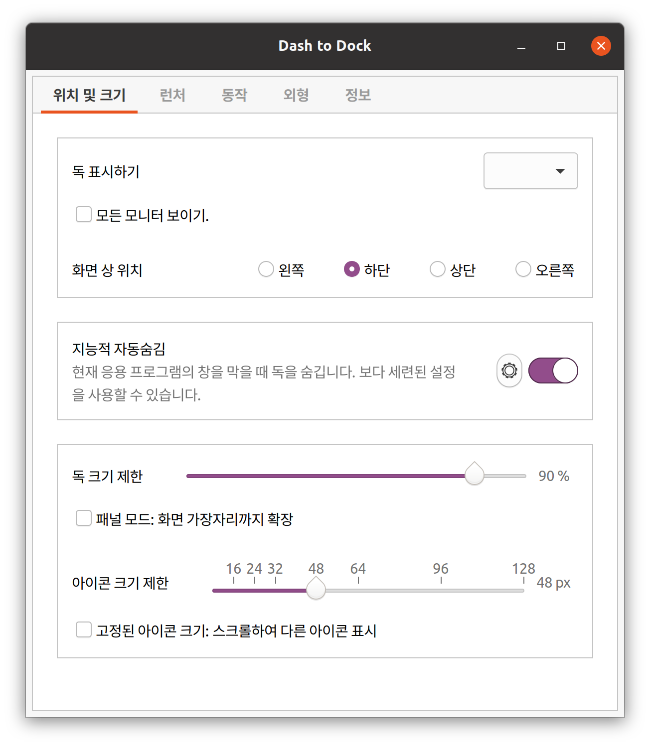 화면 상 위치를 하단으로 선택하고, 지능적 자동숨김은 취향껏 설정합니다.