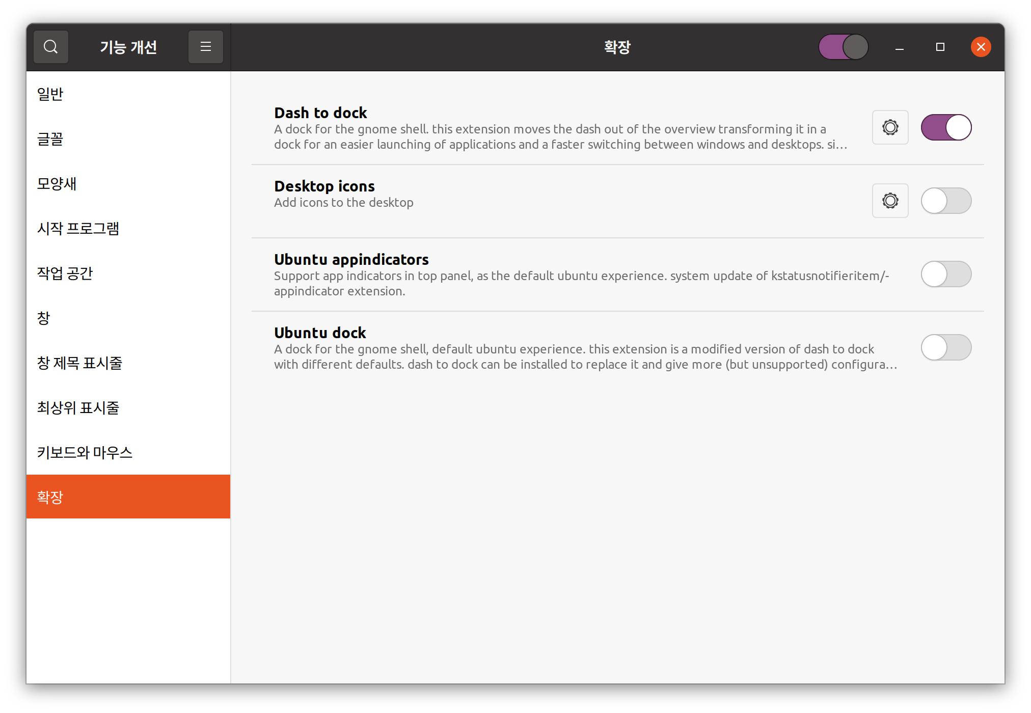 좌측의 '확장'탭을 누른 후, 'Dash to Dock' 항목의 톱니바퀴를 누릅니다.