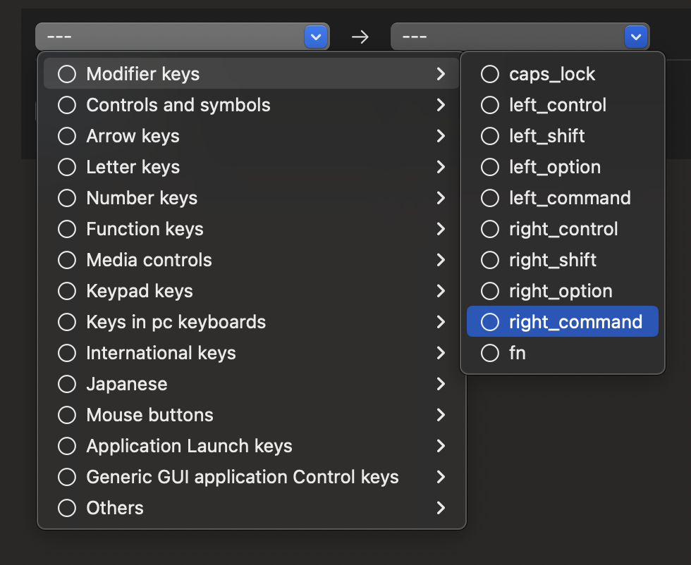 왼쪽 빈칸을 클릭하고, [Modifier keys] - [right_command]를 선택해줍니다.
