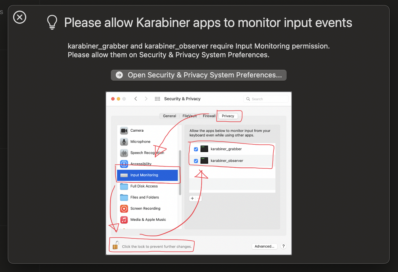 위와 같은 화면이 뜨면 자물쇠를 눌러 보안을 풀어주고, 오른쪽에 보이는 karabiner로 시작하는 아이콘들에 체크해줍니다.