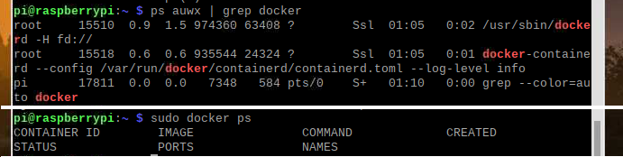 다음은 라즈베리파이에서 도커가 실행중인지 확인하는 명령어입니다.