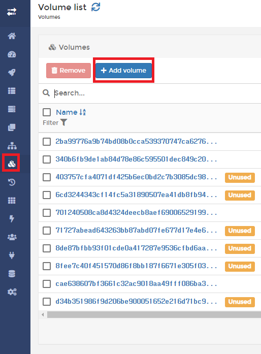 좌측 패널에서 Volumes 항목을 선택하신 후 Add volume 버튼을 눌러주세요.