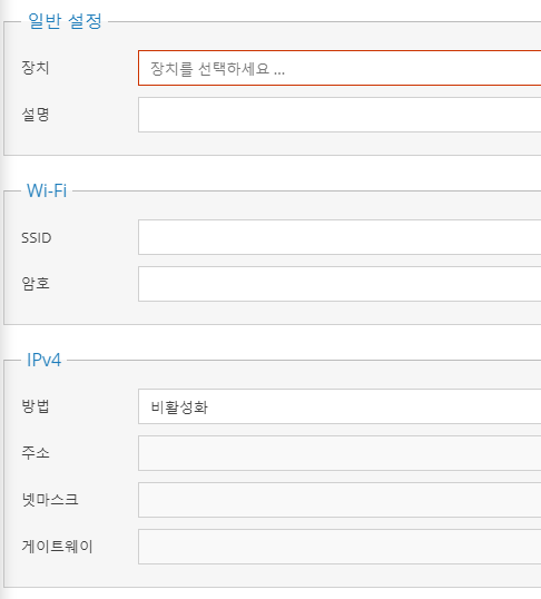 'IPv4'항목에서 원하는 IP주소와 넷마스크, 게이트웨이를 순서대로 입력하고 [저장]버튼을 클릭해주시면, 무선인터넷으로도 OMV5를 사용하실 수 있습니다.