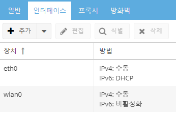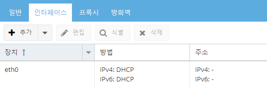 [인터페이스]탭에서 'eth0'이라는 장치명으로 작성된 표를 클릭하신 후 [편집]버튼을 눌러주세요.