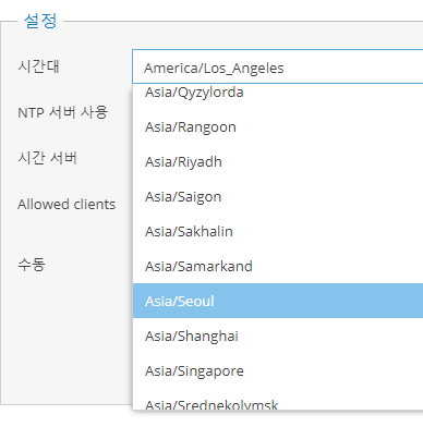 '설정'항목에서 '시간대'항목을 클릭해 'Asia/Seoul'을 클릭해주세요.