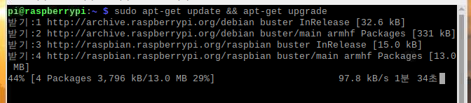 다음 명령어를 입력하여 라즈베리파이를 업데이트 합니다.